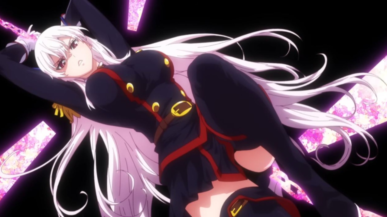 The video highlights the pop track “Cipher Cipher” performed by renowned voice actress and singer Kana Hanazawa, with lyrics teasing cryptic and playful themes like “rotating in a symmetrical loop,” “become a dog,” and “Look at me, you’re a king.” The 90-second creditless ED video immerses viewers in a vibrant purple-hued world of thorny vines, glowing chains, and dynamic character portraits. It features close-ups of female protagonists in form-fitting military uniforms with yellow accents, striking poses amid sparkling effects— from a white-haired girl summoning energy to a pink-haired character waving cheerfully, culminating in group shots of the ensemble cast in battle-ready stances against a dark, ethereal backdrop.