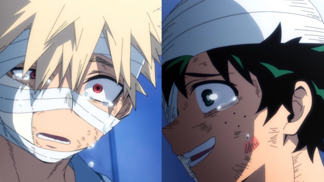 The heart of the episode, though, pulses in two intimate hospital scenes that had fans worldwide reaching for tissues. First, a bedside conversation between Deku and Katsuki Bakugo, facilitated by a gentle All Might. As Deku shares the finality of losing his Quirk—”I thought we’d go on competing and chasing each other like this from now on”—Bakugo, the explosive hothead who’s spent seven seasons masking pain with bravado, breaks. For the first time, tears stream down his face, a raw display of growth that transforms their rivalry into unbreakable brotherhood. All Might’s quiet counseling eases the room’s tension, reminding them that true strength lies in support, not supremacy. It’s a scene elevated by Ueda’s subtle direction: soft lighting casts long shadows on weary faces, while the animation captures every quiver and unspoken regret.